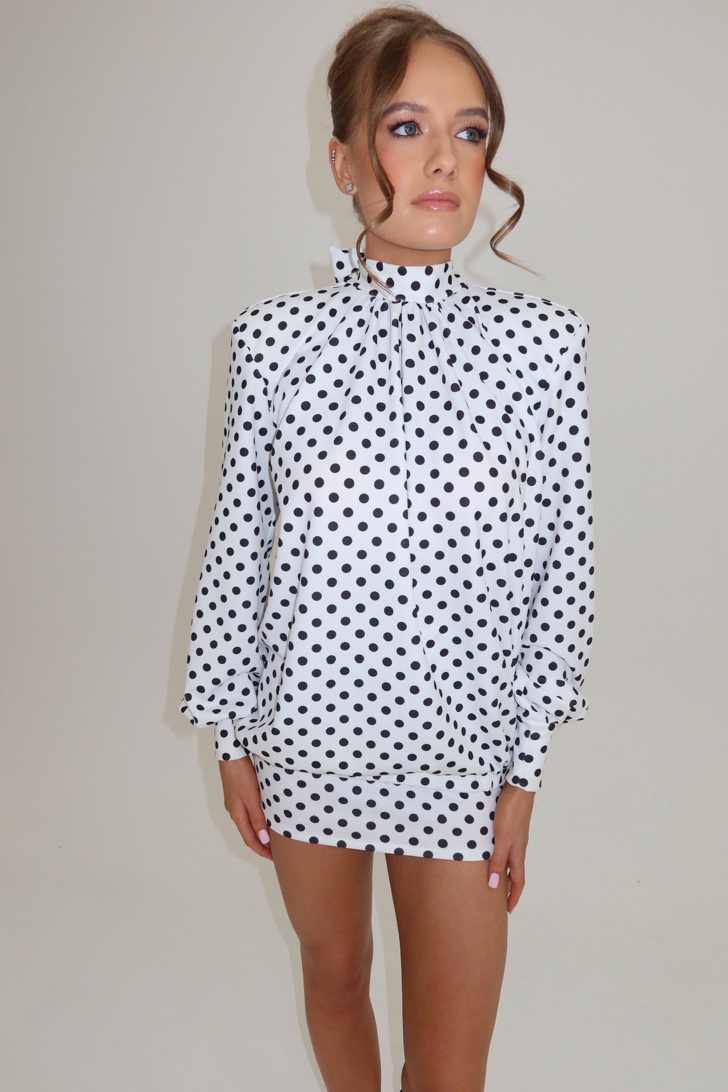Shop our polka dot co ord. Made from a stretch crepe scuba fabric, featuring gathered neck, shoulderpads, cuffed sleeves. paired with our mini skirt. & adjustable neck tie.